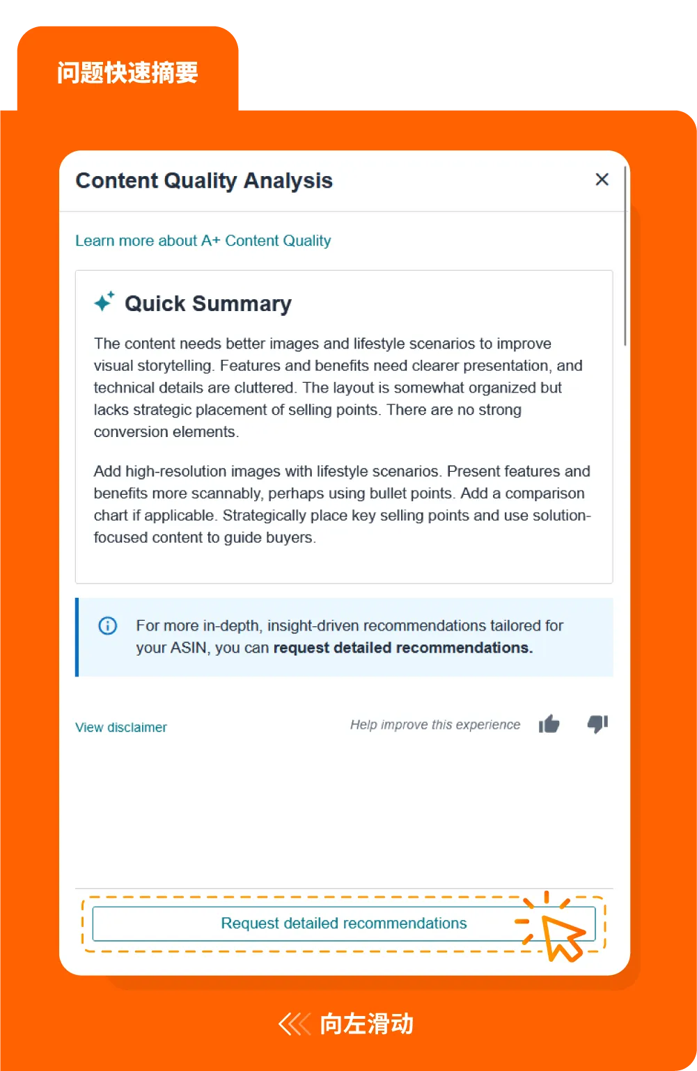 这些建议会结合商品特征和详情页信息,提供具有实际可操作性的优化方向,从而提高您的A+页面质量。
